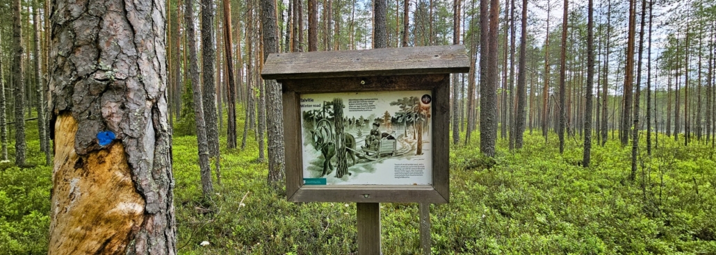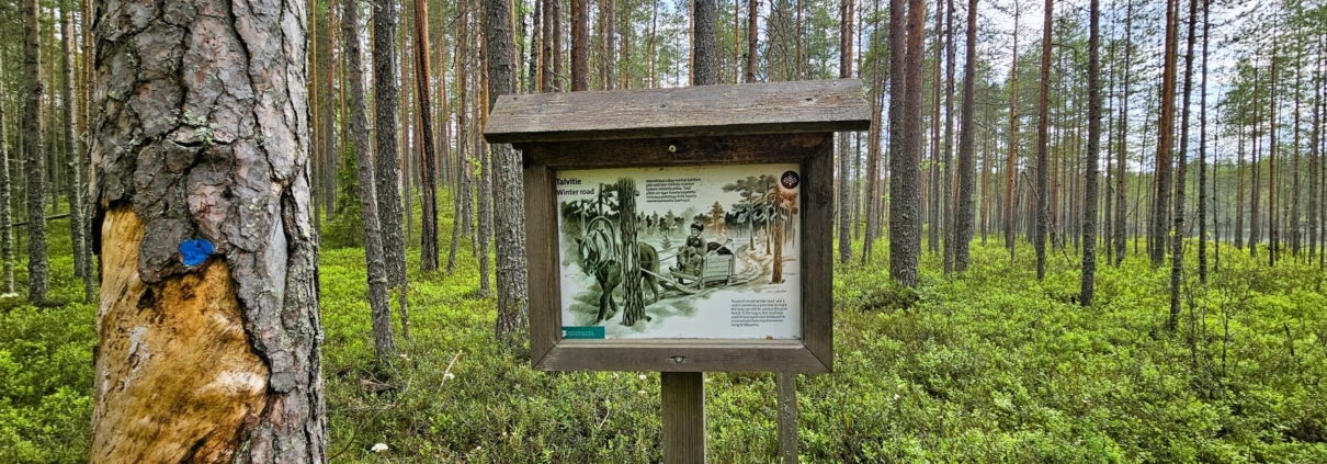 Reitin varrella oli kymmenkunta luontoon ja seudun historiaan liittyvä luontotaulu. Osa niistä oli selvästi vanhempaa vuosikertaa, kuten tämä ensimmäinen, jonka aiheena oli vanha ja nuori männikkö.