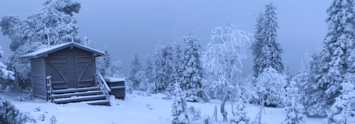Evästettynä loppupätkä ylös tunturiin hujahtikin vilauksessa. Tahkokurun kota sijaitsee upealla paikalla lähellä Kesänkitunturin lakea ja kirkkaammalla säällä maisemia olisi voinut ihailla kauaksikin. Nyt laakson peitti tiheä usva ja vain lähimmät huuruiset puut erottuivat harmaata taustaa vasten. On kumma juttu, miten valon ja värien puute etelässä tuntuu raskaalta ja ikävältä, mutta täällä, vaikka jokainen valokuva oli kuin mustavalkosuodattimella räpsitty, tunnelma oli pikemminkin kutsuva, ylevä ja harras. Emme malttaneet sulkeutua kotaan sisälle vaan istuimme juomaan kupposet glögiä taukotakin lämmössä kodan portaille, josta näkymä luontoon oli esteetön.