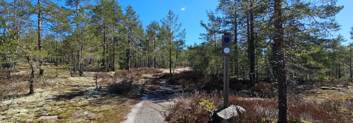 Mittauslaite päälle ja matkaan, hiekkaisessa harjumaisemassa. Ensimmäiset sata metriä retkeilyreitti kulkee melkeinpä kevyen liikenteen väylän tyylistä baanaa pitkin. Reittimerkinnät ovat sinisiä. Valkoiset merkit ovat ilmeisesti pyöräilyreittiin liittyviä. Sekä sinisiä että valkoisia opasteita näkyi mielestäni koko matkan ajan.