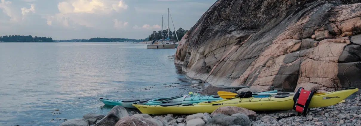 Aurinko paistaa pilvien lomasta harmaille kallioille. Haikara seisoo pitkillä jaloillaan keskellä edessämme olevaa luotoa. Kauempana väikkyvät valkoiset purjeet. Pirteän väriset kajakkimme makaavat väritäplinä jääkauden sommittelemien kivien katveessa. On vaikea uskoa, että olemme vain viiden kilometrin päässä Kampista.