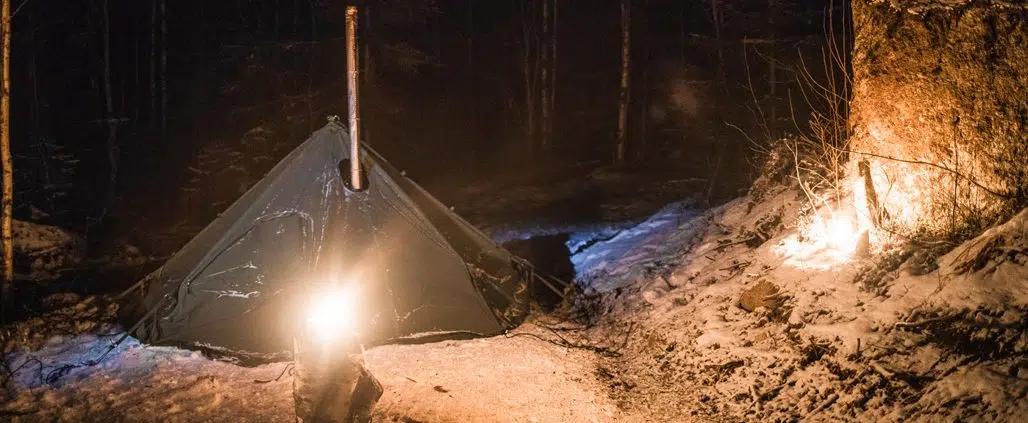 Pimeässä kävelimme takaisin Mikon laavulle ja Hawu-teltalle. Siinä ruokaa odotellessa koelämmitimme teltan yhden kerran ja noin neljässä pakkasasteessa se lämpeni nopeasti. Varsinainen lämmitys jäisi nukkumaanmenoaikaan, sillä vaikka kangas paksua olikin, se ei kuitenkaan kauaa pidä lämpöä.
