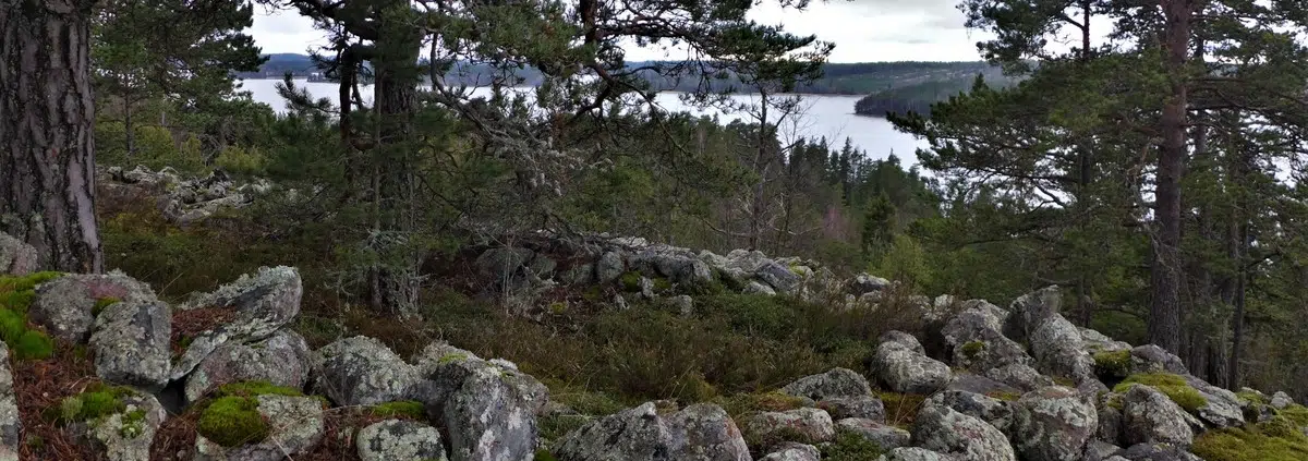 Kruunulta avautuu näkymä eteenpäin länteen laskevalle niemenkärjelle, jossa seuraava hauta on kuitenkin piilossa pienen metsikön keskellä. Sinne siis!