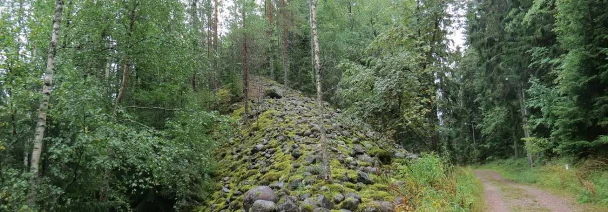 Ja seuraava tietoisku odottaa taas sadan metrin päässä. Noin 11 600 vuotta sitten jääjärven vedenpinnan laskeutumisen yhteydessä tähän kohtaan jäi kivikkoinen rantavyöhyke muinaisrannaksi eli pirunpelloksi. Näitä rantakivikoita näkee monella kohdin reittiä. Tässä kohdassa on tämän luontopolun vaikuttavin pirunpelto.