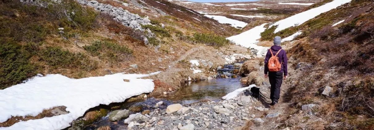 Vaikka suurin osa lumista oli jo sulanut pois, oli polku paikoin märän lumen alla ja eteneminen vaati hieman harkintaa ja taiteilua. Upean aurinkoisessa kevätsäässä tällä ei kuitenkaan ollut meille väliä, retkestä oli tulossa täydellinen. Olen sittemmin kuullut huhuja, että Vatikurussa pidettäisiin talvisin myös avantoa – tämä olisi upeaa joskus testata. Nytkin minun teki mieleni kellahtaa puron raikkaaseen veteen, mutta sain hillittyä itseni.