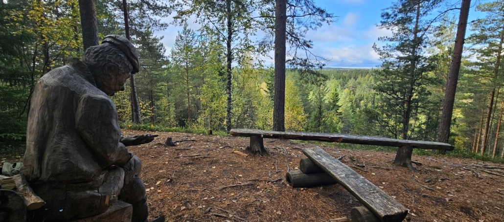 Reitillä riittää taukopaikkoja. Tänne Komionvuorelle oli tullut uusia penkkejä useampikin. Yhden penkin toisessa reunassa istuu kännykkää tutkiva hahmo. Kännykässä muuten luki ”Lopen uupunut mies”. Istuskelin hetken herran vieressä ja join toisen kupin kahvia. Ryhmä maastopyöräilijöitä suunnitteli täällä reitin jatkoa ja lähti polkemaan eteenpäin jylhissä maastoissa.