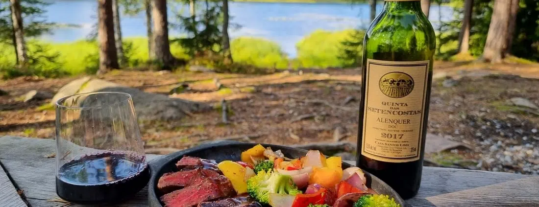 Tämän jälkeen otin suunnaksi Alkon. Hieman tiedän itsekin erilaisista viineistä ja niiden soveltuvuudesta eri ruokalajeille, mutta pyrin kuitenkin ottamaan asiantuntevammankin mielipiteen huomioon viiniä valittaessa. Tästä olikin hyvä lähteä selittämään henkilökunnan edustajalle: Mulla on sellainen visio, että paistan metsässä nuotiolla naudan ulkofileetä ja siihen sitten tarvittaisiin joku pieni punainen. Hieman mietittyään myyjä ehdotti portugalilaista Quinta das Setencostas 2017 -viiniä. Tämä oli kyllä ehdottomasti oikea ehdotus.