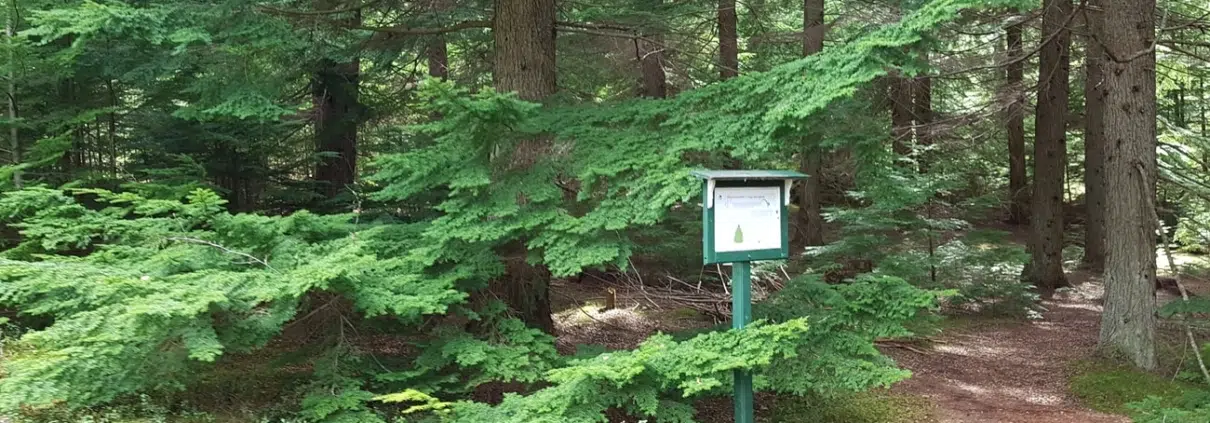 Pihapiirin leveiltä teiltä käännytään vähän kapeammalle polulle. Nyt alkaa havumetsien osuus. Seuraavan kilometrin aikana voi tutustua useaan havupuulajiin, pihtoihin, lehtikuusiin, tuijiin, hemlokkeihin.