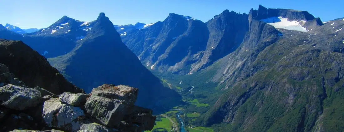 Toisessa suunnassa näkyi huippujen välissä, lumen lisäksi, sinisiä jäätiköitä ja yksi Euroopan korkeimmista yhtenäisistä kalliojyrkänteistä, Trolveggen. Korkeimmat näkyvät huiput kohoavat lähes kahden kilometrin korkeuteen. Sininen taivas ja aurinko kruunasivat kauneuden. Tämä oli hetki, jonka toivoisi kestävän ikuisuuden, ei edes tuullut kovin paljoa.