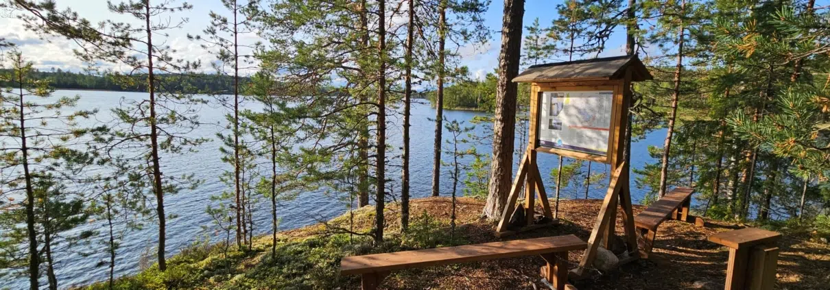 Seuraava kilometri kuljetaankin sitten aivan rannan tuntumassa. Puolentoista kilometrin kohdalla kyltti johdattaa näköalapaikalle. Maisema aukeaa kauniille Rovonlahdelle. Saimaa Geoparkin pystyttämä kyltti kertoo mm. Saimaan alueen geologiasta kivilajeineen, harjuineen ja reunamuodostumineen.