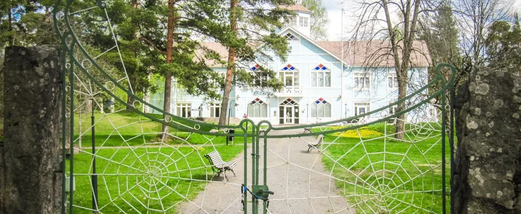 Päätämme käydä museossa sisällä kunhan olemme ensin tutustuneet piha-alueeseen paremmin. Tiemme vie päärakennuksen ovelta kohti puutarhaa ja keskikäytävän päässä olevaa Hämähäkinseittiporttia. Syvärannan puutarhan keskikäytävä on aina sijainnut samalla paikalla ja päättynyt Hämähäkinseittiporttiin. Tällaisia portteja ei ihan usein näe. Portti on suomalaista käsityötä ja se on valmistettu 1900-luvun alussa tamperelaisella T. Wikholmin metalliverstaalla. Portin metallinen teksti on vaihtuut aikojen saatossa ja omistajien vaihtuessa. Nykyisin portissa lukee ”Syväranta Lottamuseo”.