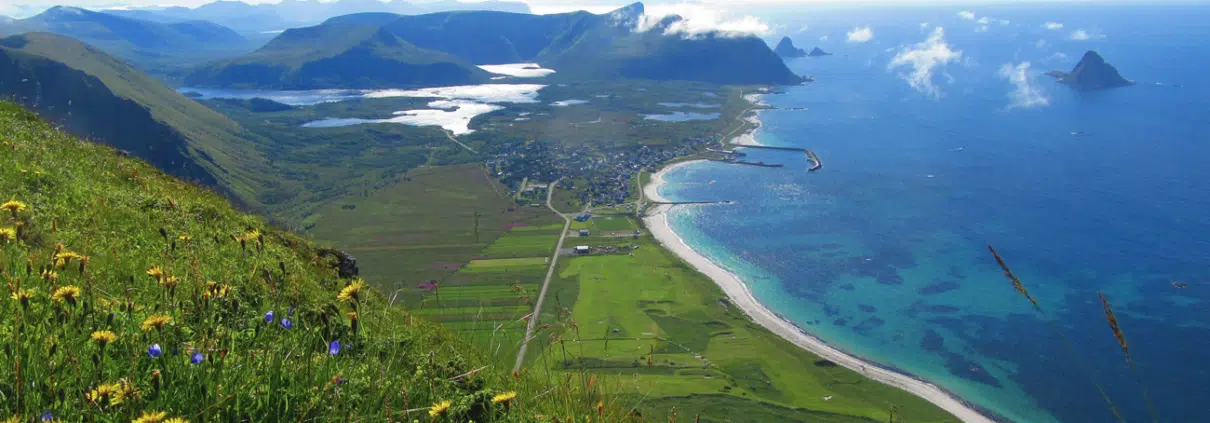 Miltä näyttää Norjan pisin yhtämittainen hiekkaranta Bleikstranda lintuperspektiivistä? Siitä voi ottaa selvää nousemalla läheiselle Røykenin huipulle 468 metrin korkeuteen. Kohde sijaitsee Andøyan saarella Västerålenissa. Katso myös video matkastamme jutun lopusta!