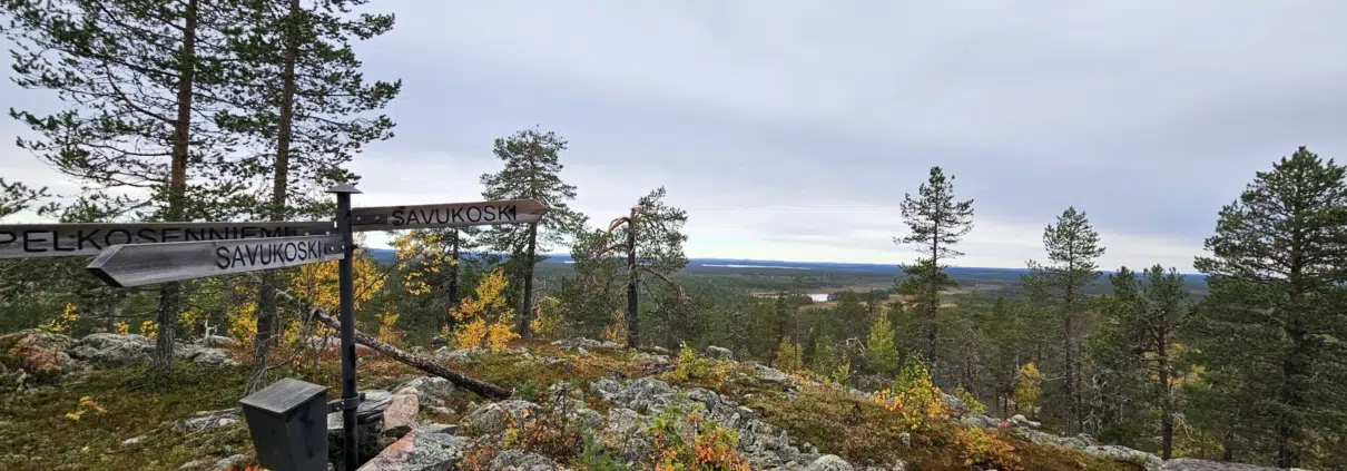 Pelkosenniemeltä, Savukoskelle, Sodankylään ja takaisin Pelkosenniemelle. Kaikki vajaan viiden kilometrin Nuolivaaran luontopolulla.