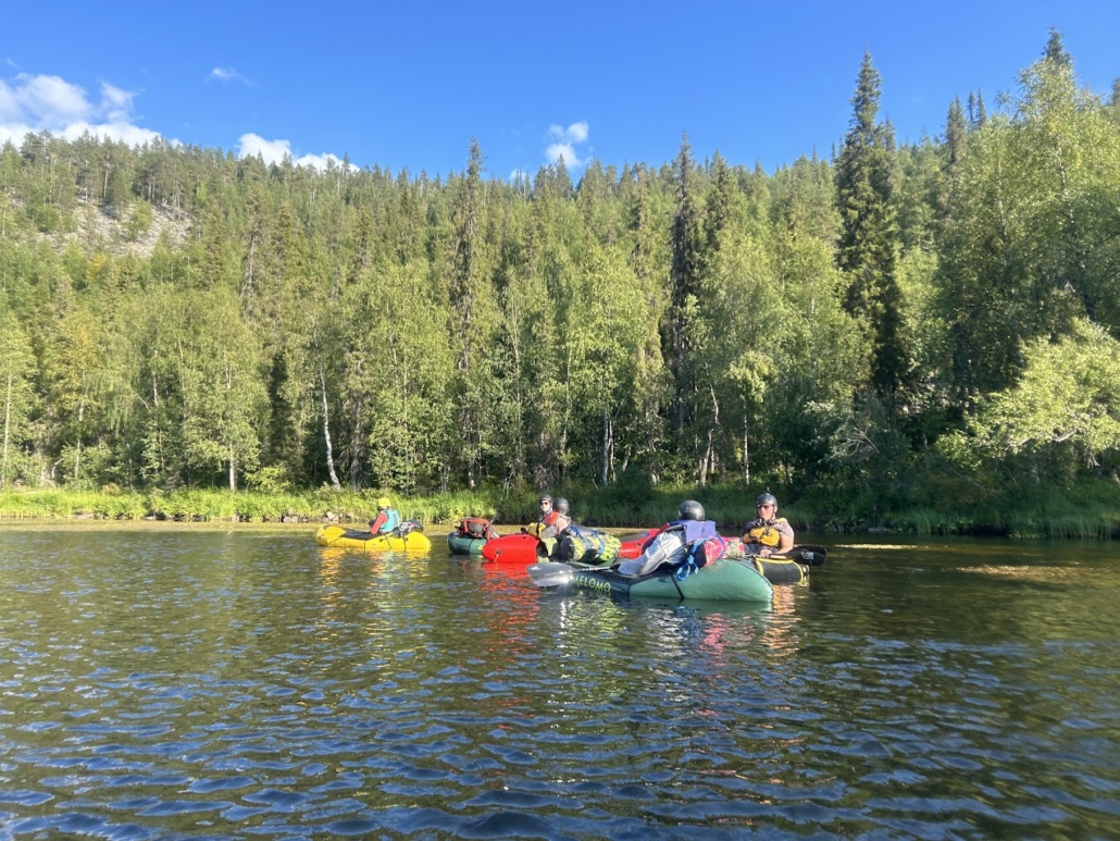 Sää pysytteli edelleen lämpimänä ja joki virtasi suhteellisen vilkkaana, mutta paikallisoppaamme mukaan hyvin vähävetisenä. Edessä olisi paljon pieniä koskia ja vauhdikasta menoa. Aiemmin en itse pitänyt kovinkaan paljon koskien laskemisesta packraftilla, mutta nykyään olen oppinut suorastaan rakastamaan sitä. Koskien melonnassa tarvitaan pelkän huimapäisyyden sijaan taitoa lukea kosken ja virran liikkeitä ja löytää oikeat laskuväylät. Se on todellista meditaatiota, jonka aikana ei voi keskittyä miettimään muita murheita, tai löytää itsensä hyvin nopeasti hyytävän veden syleilystä tai nököttämästä rafteineen kivellä.