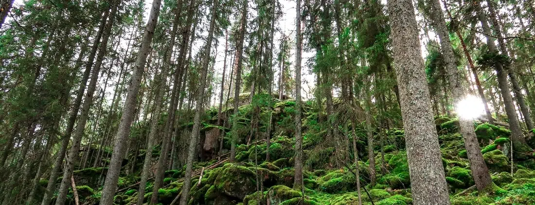 Polku lähti viettämään alamäkeen ja saavuin itselleni hyvin eksoottiseen maisemaan. Rinne oli todella suuri ja jylhä, ja ihanasti sammaloitunut rinnekivikko sai minut tyystin lumoihinsa. Miten upea maisema! Korkea kuusikko kätki tasaharmaan taivaan ja toi sammalikkoon juuri mukavaa peikkometsän tuntua. Minua ilahdutti sammalikon eheys sekä paikan muhkea mittasuhde. Jyrkkä rinne tuntui viettävän alaspäin vaikka miten pitkälle, kaatuneet puut kirjoivat sitä kuivine runkoineen ja pystyynnousseine juurakoineen. Kääntyilin jatkuvasti katsomaan taakseni ja sivuilleni suu auki, en muista olenko koskaan mahtanut nähdä tällaista maisemaa.