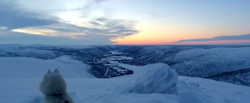 Saimme kavereilta kelkkakyydin tunturin huipulle ja suunnitelma oli, että kävelemme alas. Heti huipulla oli kuitenkin pysähdyttävä ihailemaan mieletönta maisemaa Tenojokilaaksoon.