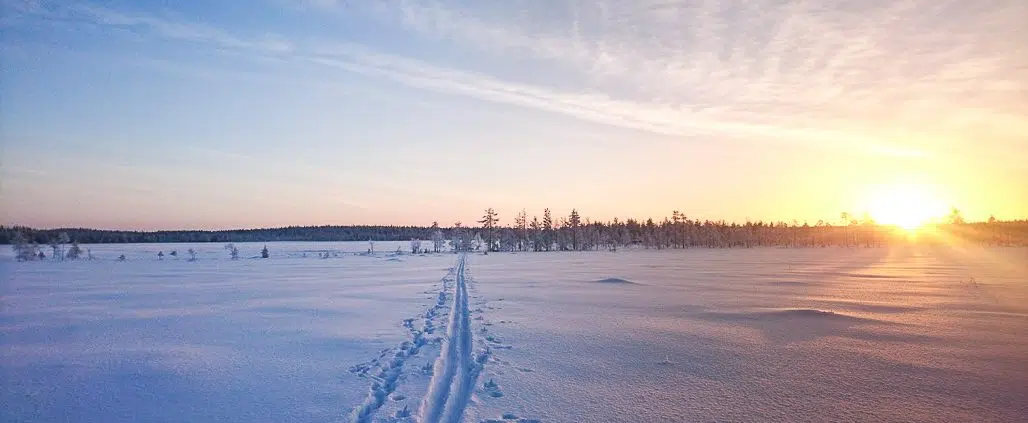 Vähän puolen päivän jälkeen olinkin jo kiinnittelemässä suksen siteitä saappaisiin. Taivas oli sininen, ja ilma tuntui kiristyvän. Hiihtelin kohti Karhusuota, ympärillä avautui ensin luminen metsä, sen jälkeen kimmeltävä suo sekä metsän takaa hädin tuskin kurkistava aurinko.