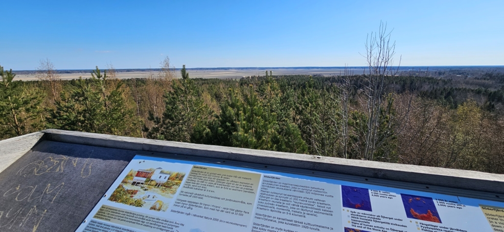 Kävin kesällä 2019 Vaasassa ja ihastuin silloin Söderfjärdenin meteoriittikraatterin maisemaan. Sen on arveltu syntyneen noin 520 miljoonaa vuotta sitten, kun palava taivaankappale iskeytyi maahan. Alun perin kraatteri on ollut noin 300 metriä syvä, nykyisin siitä on näkyvissä vain metsäinen ulkoreuna ja pyöreä muoto. Tällä Vaasan reissulla päätin kävellä Öjbergetin luontopolun, joka kulkee kraatterin pohjoisreunalla. Arvelin näkeväni kraatterimaisemaa ylävinkkelistä.
