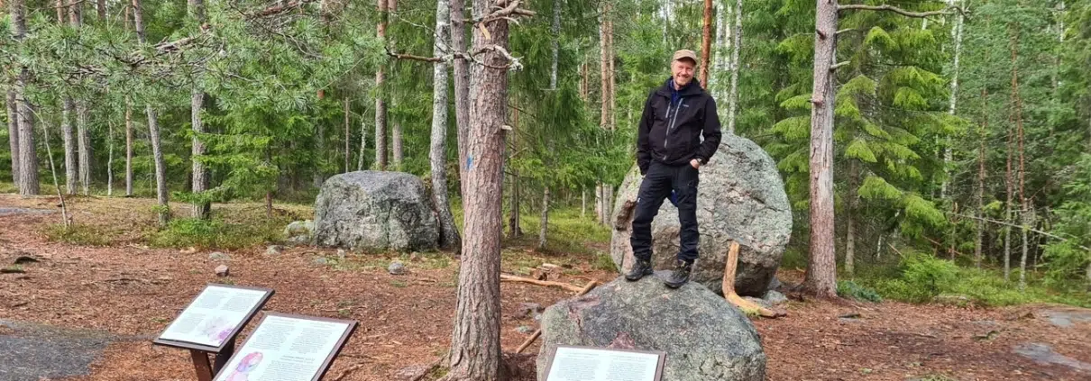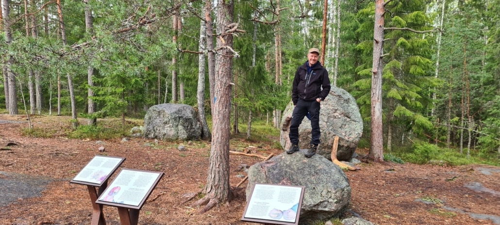 Jo noin sadan metrin päässä tullaan ensimmäiselle rastille, jonka aiheena on silokalliot ja hillittömät hiidenkivet. Jokaisella rastipisteellä on kolme eri taulua – faktoja ja tehtäviä. Tämän rastin hiidenkivitaulussa ehdotetaan nousua ison murikan päälle ja maailman tarkastelua jättiläisen näkökulmasta. Blogin pääkuvassa onkin asettauduttu jättiläisen asemaan! Toisaalta – toisessa taulussa ehdotettiin kallion tunnustelemista poskella tai jopa kielen päällä, se meitä hieman huvitti ja epäilytti.