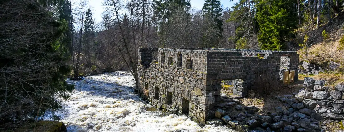 Jo muutaman askeleen jälkeen saavuimme kiviraunioille. Minusta ne näyttivät ihan linnan raunioilta, mutta infotaulu oli osannut kertoa, että tässä on ollut mylly. Voimakkaan kosken pauhuilla on aikoinaan pyöritetty myös muun muassa sahaa, ja onpa täällä viinaakin kuulemma valmistettu.