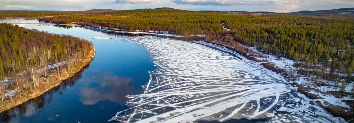 Ilmakuva Ounasjoelta, josta jäät ovat osittain lähteneet. Vesipääskyjä. Toukokuinen takatalvi. Telkkä ja kuutamo kevään ensimmäisinä yöttöminä öinä.