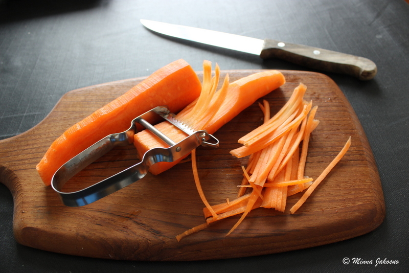 Itse käytän tähän ruokaan porkkanoiden pilkkomiseen juliennerautaa, jolla saa ihanan pientä suikeroa. Karkea porkkanaraaste käy varmasti ihan yhtä hyvin. Kun porkkanat on suikaloitu, kaadan päälle keitettyä vettä, annan olla hetken ja siivilöin. Taputtelen ylimääräisen nesteen pois pyyhkeellä ja kuivaan kuivurissa.