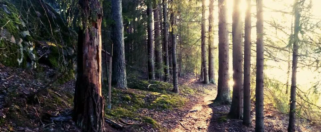 Ennen mäkeä ympäröivää metsikköä tulee pienen pieni silta, ja polku kaartaa lopulta puiden suojaan. Muutaman hetken kuluttua huomaakin päätyneensä Jokipolun (2,5 km) alkuinfotaulun luokse. Osuuden voi siis kulkea myös toiseen suuntaan. Jokipolulla reittimerkinnät kun eivät ole kulkusuunnasta riippuvaisia.