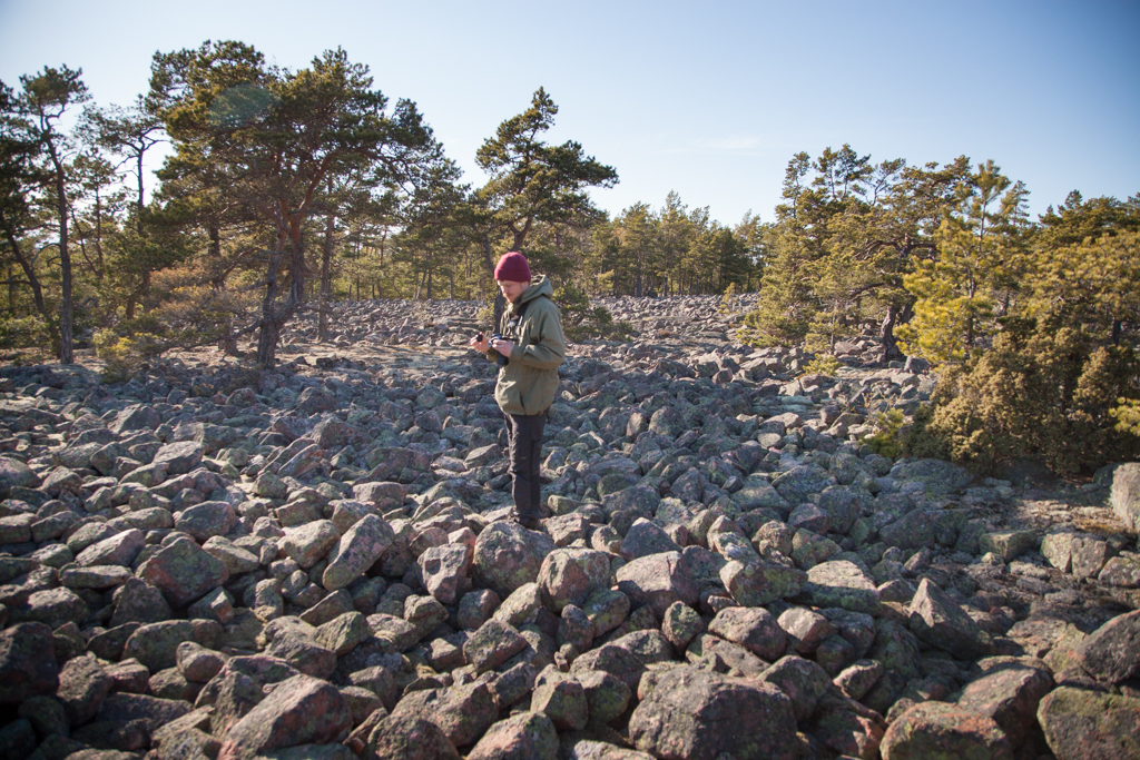 Jonkun reissun saarelle tehneenä minulla oli jonkinmoinen aavistus, millaisten karttamerkkien luota luolaa kannattaisi hakea. Koska Söderbyn alueelle ei ollut kuin yksi erittäin lupaavalta vaikuttanut paikka, suuntasimme ensimmäiseksi sinne. Harmittoman parkkipaikan löytäminen teetti hetken töitä, kunnes hoksasin päätieltä mäen laelle maston juureen pistävän tienpätkän. Koska kieltomerkkejä tai puomeja ei ollut näkyvissä ja perille mahtui hyvin auton jättämään, hyppäsimme koslasta maastoon.