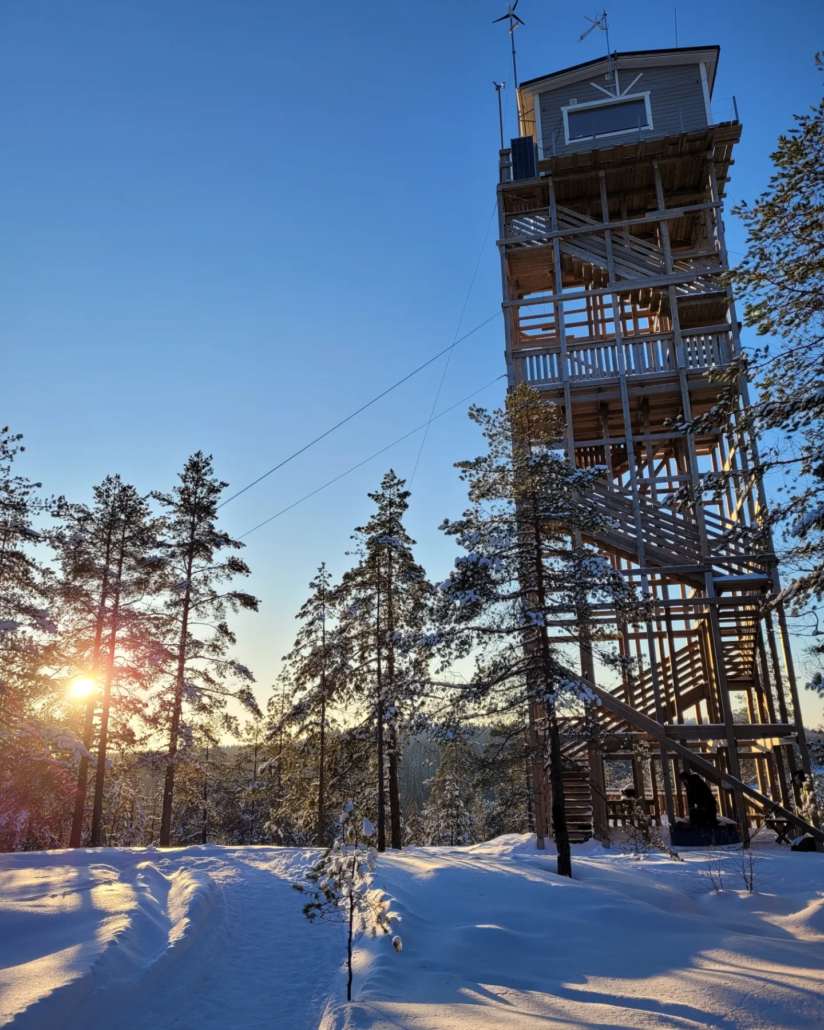 Auringon alkaessa painua taivaanrannan taakse, palailimme saunareissultamme takaisin Häähninmäelle. Mahtava näkötorni kohosi korkealle kohti taivasta. Edelliset yöpyjät olivat jo päivällä lähteneet mökistä, ja kello kuudesta alkaen näkötorni muuttui jälleen varaustuvaksi. Kaivelimme ahkion syvyyksistä tarpeelliset pussukat ja nyssäkät mukaamme ja lähdime kapuamaan ylös torniin.
