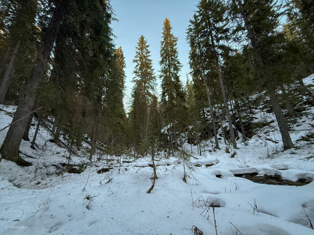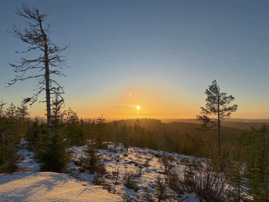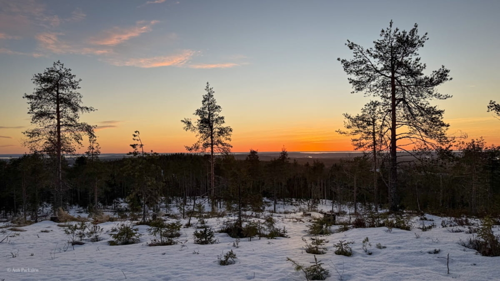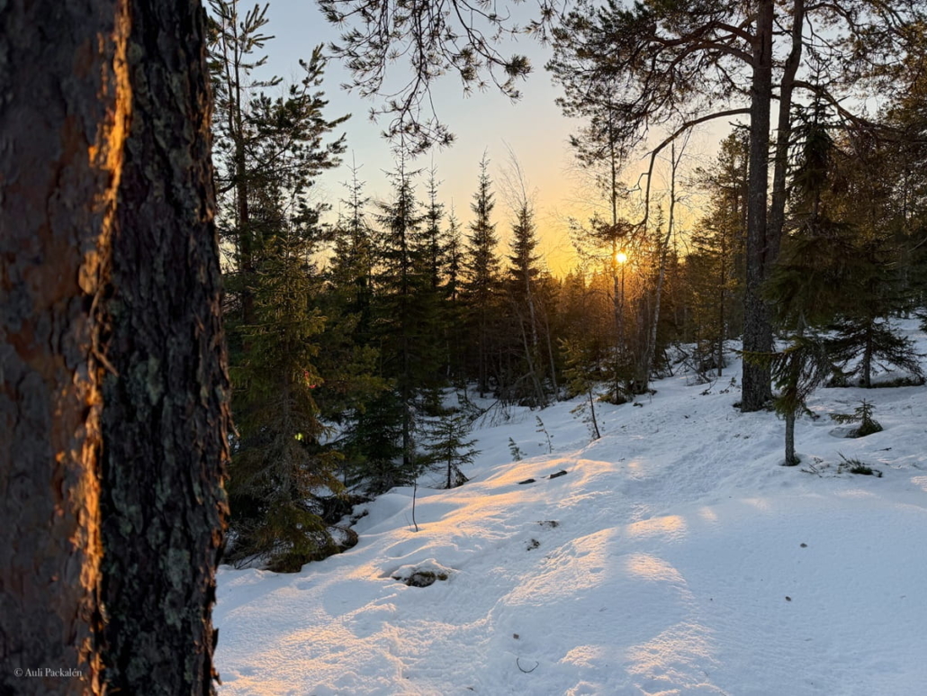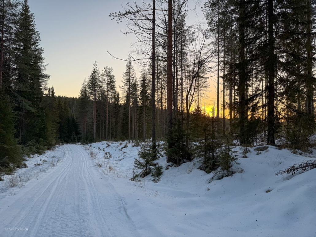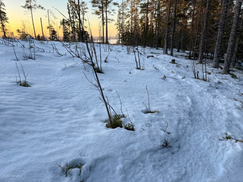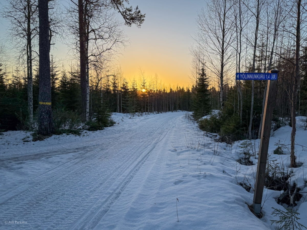 Jatkoin Yölinnunkurun ja Valkeisenkallioiden piston jälkeen Kurun polkua myötäpäivään. Lähestyvä auringonlasku värjäsi pilvetöntä taivasta, ja hyväpohjaista kelkkauraa matka taittui vauhdilla. Parin kilometrin jälkeen reitti yhdistyi Kantolan lenkkiin. Kelkkaura kääntyi oikealle kohti risteystä, josta olin aiemmin kääntynyt Kurun polulle. Käännyin risteyksestä vasemmalle seuraten Kantolan lenkkiä ja tallattua uraa kohti etelää.
