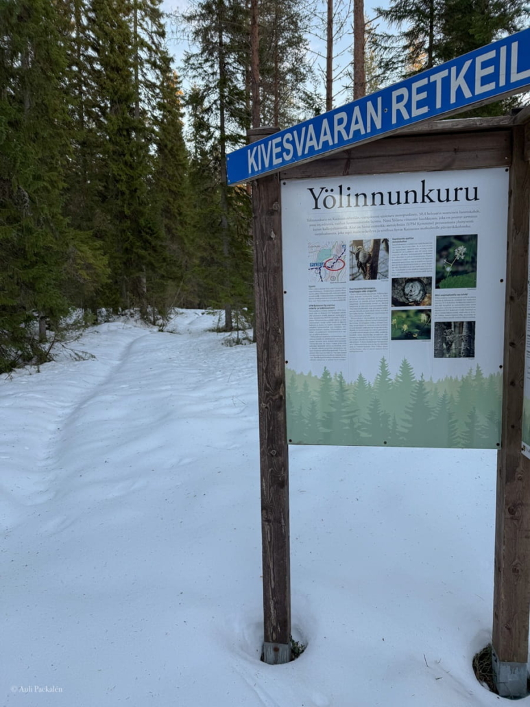 Selvittelin jälkikäteen, että moottorikelkkaura ei ollut sattumaa. Osa Kivesvaaran retkeilyreiteistä ajetaan kelkalla säännöllisesti, jolloin niillä kelpaa kävellä, juosta ja hiihdelläkin läpi talven.