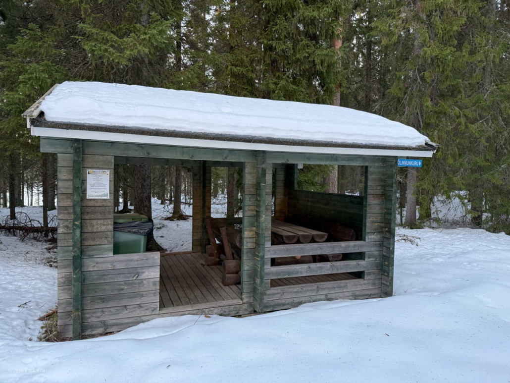 Reilun kilometrin jälkeen saavuin kohtaan, josta Kurun polulta lähtee pistopolku Yölinnunkuruun ja Valkeisenkallioille ja jossa on myös katettu taukopaikka. Sulan maan kaudella paikalla on Kivesvaaran alueen toinen parkkipaikka.