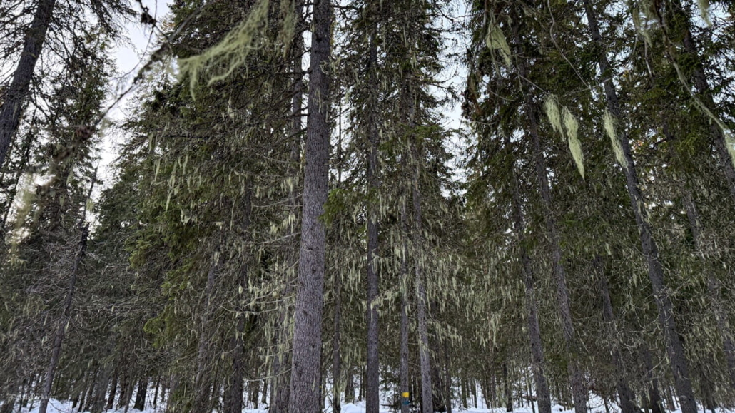 Yölinnunkurun metsä on lähes luonnontilaista, tiesi opastaulu kertoa. Sen myös huomasi. Kuuset kohosivat korkeuksiin, ja laskeva aurinko korosti niillä hulmuavia naavoja ja luppoja.