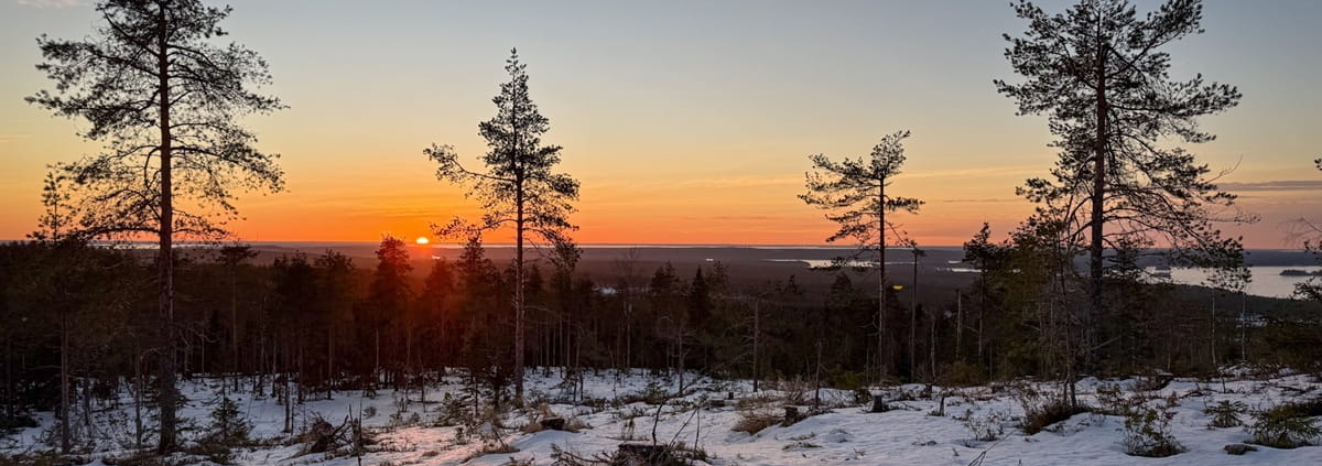 Kun lähestyin Kivesvaaran lakea, aurinko oli juuri laskemassa. Näkymät etelään ja lounaaseen Oulujärven suurille selille olivat lähes esteettömät. Pysähdyin vaaran laelle katsomaan, kun aurinko katosi horisonttiin. Yhteensä reilun kympin reissu sai hienon huipennuksen.