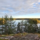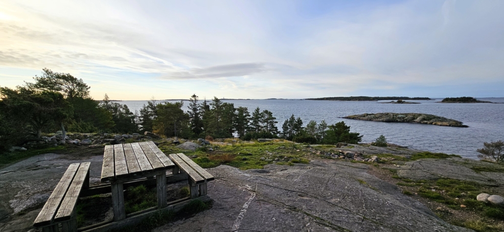 Komein maisema aukeaa täältä kohti etelää ja lounasta. Kuvittelen vasemman reunan tornin olevan Kallbådan majakka. Siihen liittyy tarina, jonka kirjoitin edelliseenkin Pampskatan-blogiini – olen viettänyt kesäisen päivän Inkoon saaristossa ja sinä päivänä kävimme myös veneretkellä Kallbådan majakan tuntumassa. Uimme majakalle hylkeiden katsellessa ihan vieressä. Ikimuistoinen kokemus. Edit: Majakka on kuitenkin oikeasti Rönnskärin majakka. Kallbåda on huomattavasti kauempana avomerellä.