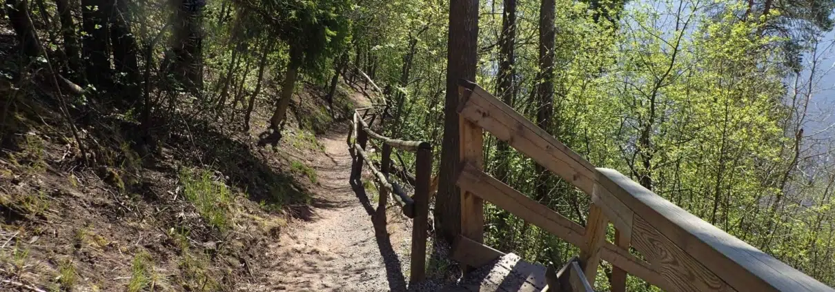 Polku alkaa vähitellen nousta ylemmäs. Kaiteet suojaavat kapealla polulla kulkevaa.