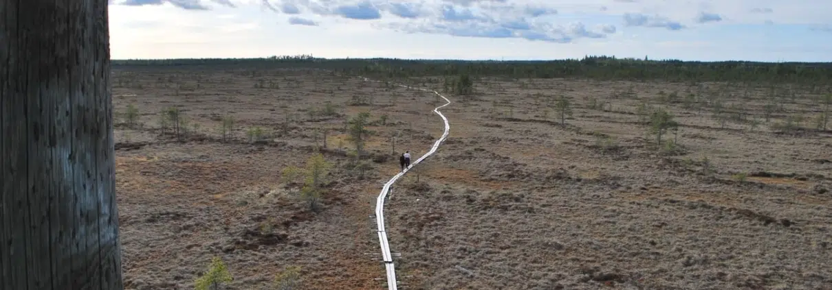 Varusteet/jalkineet: Pitkospuilla pärjää lenkkareillakin. Suolla toki vedenpitävät jalkineet aina hyödylliset, voi astua myös pitkospuiden ulkopuolelle.