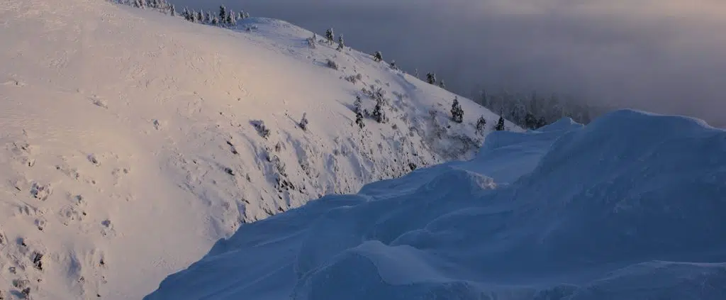 Sumu alkoi ylhäällä vihdoin hälvetä ja tammikuisen lyhyen päivän valo lankesi lempeänä tunturin kyljen tykkyhahmoihin.