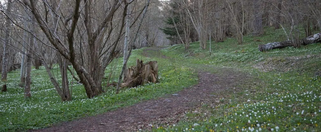 Jos jo lähestyminen oli kaunista, niin toisella puolella aitaa aukesi satumetsä. Vuokkomeri, pähkinäpensaat ja siellä täällä kasvaneet ylväät tammet olivat sykähdyttävä yhdistelmä.