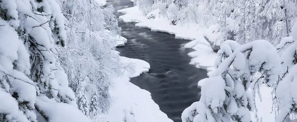 Kosken aaltojen korkeus ja voima estää niitä jäätymästä. Vain muutama päivä ennen tämän kuvan ottamista tammikuussa 2016 Kuusamossa lämpötilaksi mitattiin -39,3 astetta.