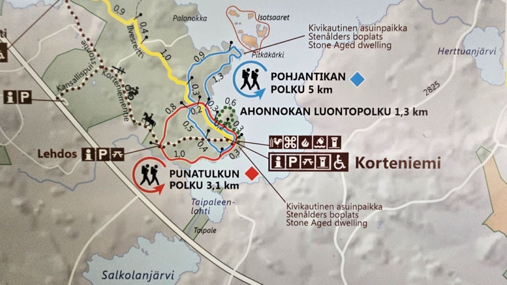 Sää oli koko ajan muuttunut paremmaksi. Kävely tuntui mukavalta. Minulla ei ollut kiire mihinkään ja eväätkin oli vielä syömättä. Olin tosi hyvällä tuulella ja sain idean: mitäpä jos kävelisin vielä Punatulkun polunkin ihan oikeaa ja virallista reittiä pitkin. Nyt oli vain löydettävä taukopaikka ennen toista kierrosta. Korteniemen pohjoispuolella olin jo huomannut tulipaikan kyltin, joten tallustelin sinne kahville ja eväsleiville.