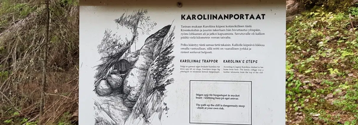 Kansanparantaja Karoliina Raatikainen joutui kulkemaan jylhän, portaikkoisen kallioseinämän kautta kotimökilleen kesät talvet. Tänne, Karoliinan portaiden juurelle, on luotu nyt mukava pieni luontopolku. Jyrkänteen alla on suuria kivenlohkareita täynnä oleva lehtomainen kuusimetsä, jossa on tunnelmallista tallustaa.
