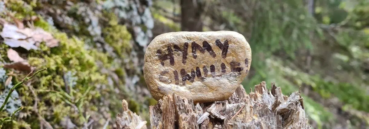 Nyt oli tarjolla hieman kovempi nousu, noin 50 metriä korkeuseroa. Puolivälissä bongasin polun laidalta kiven, johon oli kirjoitettu hauska teksti: ”Hymy sinulle” (blogin pääkuvassa). Ja lopulta olin Siliävuoren huipulla ja näkötornin juurella. Yllättävän korkea ja kapea torni. Hieman jännittyneenä kiipesin sen huipulle.