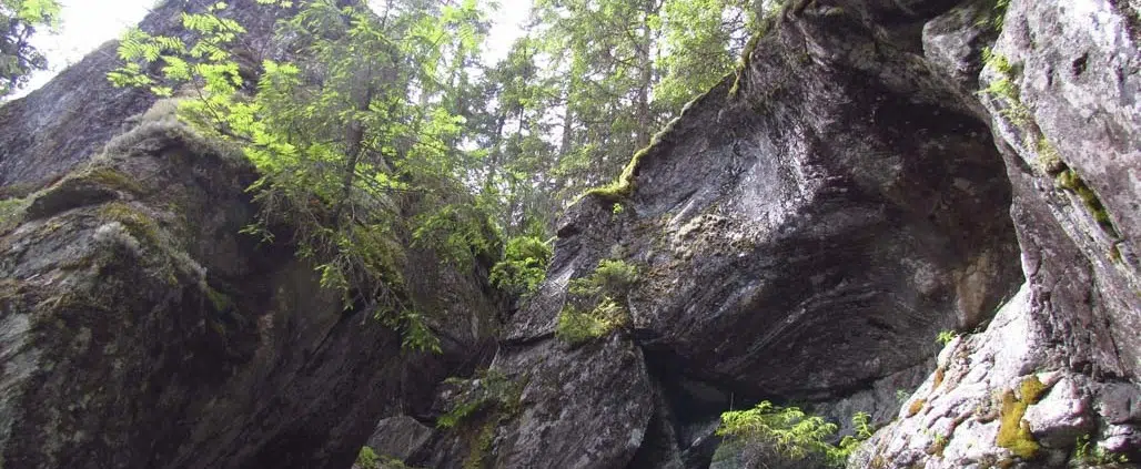 Lopultakin Pumpulikirkko: siinä se nyt olisi. Edessä siinsi korkeassa kallioseinämässä oleva aukko, joka kätki sisäänsä hiidenkirnun. Aikanaan kallioseinämä on joutunut antamaan periksi veden ja eroosion voimalle. Voi helposti sanoa, että Pumpulikirkko on eräs vaikuttavimmista kirnuista mitä olen maassamme tavannut.