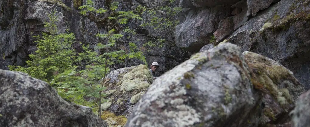 Suuresta kammiosta pääsi edelleen ujuttautumaan alemmas toisen pienemmän kammion kautta avorakoon, joka johti kalliolle päin. Arvoimme siinä hetken, mihin suuntaisimme, mutta sääoloista johtuen arvelimme kallionpoven paremmaksi tutkimuskohteeksi kuin sammaleisen lohkareikon. Niinpä kipusimme eteenpäin.