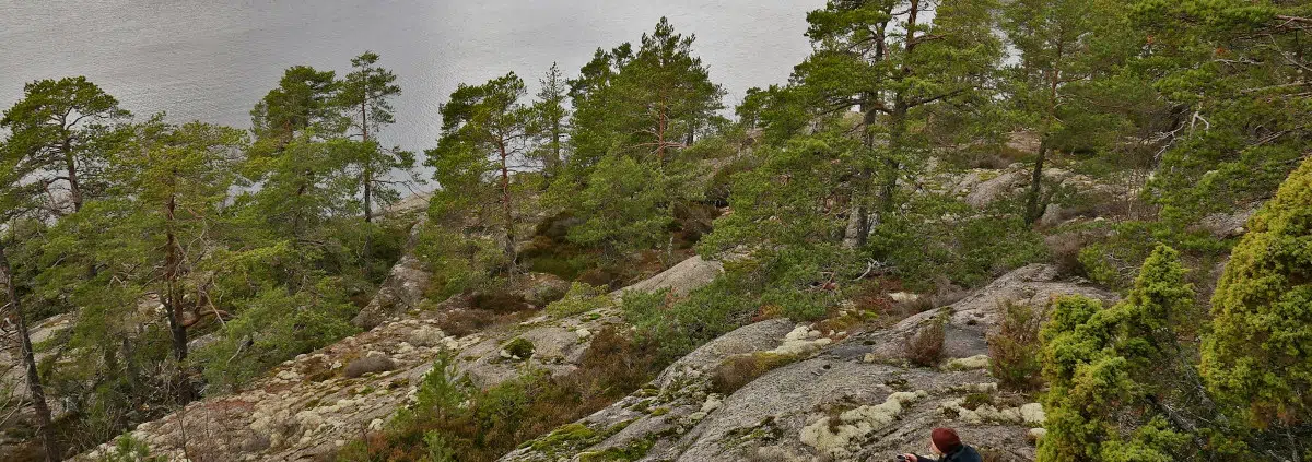 Meri pilkottaa vähän väliä kalliomännikön takaa, ja hieman ennen hiekkatielle saapumista avautuu upeat näköalakalliot. Jos tämän paikan olisin tiennyt, olisin säästänyt yhden taukohetkeni tänne!
