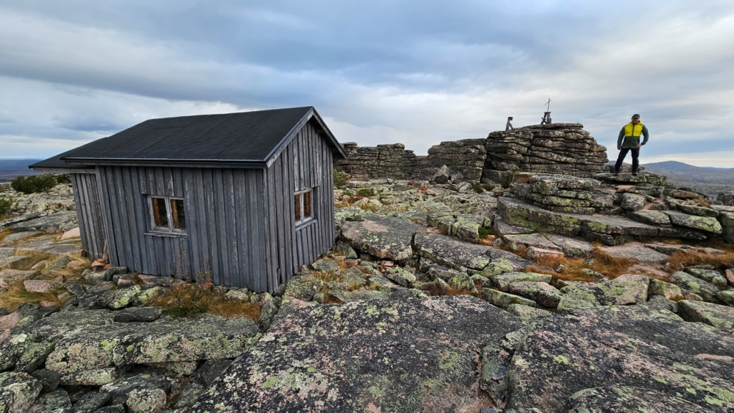 Nyt on huippu ja palovartijan maja näkyvissä. Maja on joskus toiminut päivätupana, nyt siellä ei enää ole kamiinaa eikä kaasuliettä. Sääsuojana se toki toimii. Tänäänkin oli pientä sateen uhkaa ja jokunen pisara tuli vettä, kun huipulle pääsimme. Myös tuuli oli aika navakkaa.