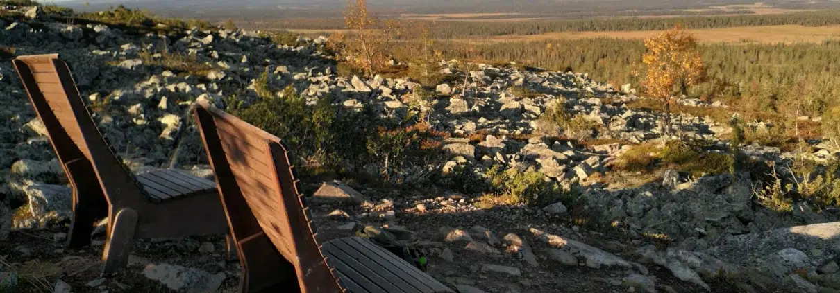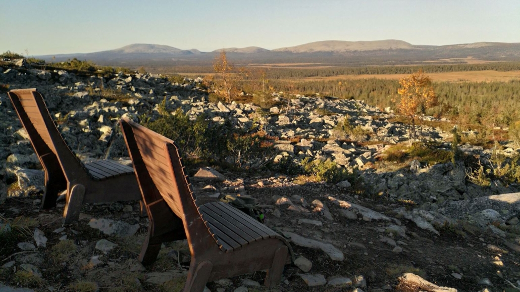 Hieman edempänä löysin jotain, mikä ei suoraan luontoon kuulu, mutta jotain joka ilostutti kovin. Nimittäin puiset penkit, joilta sai katsella upeaa maisemaa kohti pohjoisempana olevia tuntureita. Tämä oli koko retken upein paikka.