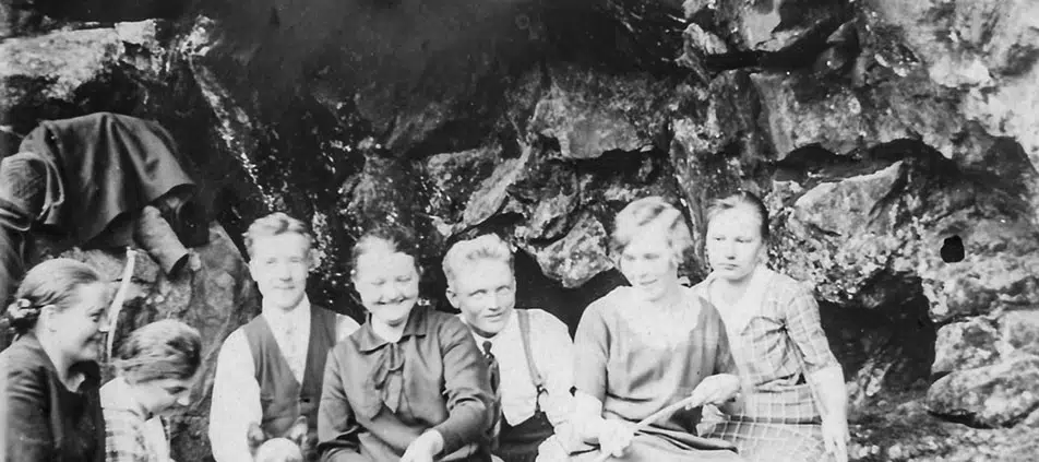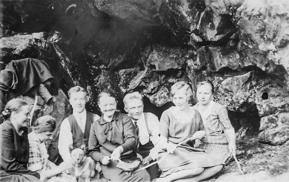 Sitten muistui emännälle mieleen, että isotätin toisessa kansiossa on kuva 1920-luvulta, jossa on taustalla kalliota. Pohimme että liittyykö kuvat toisiinsa? Emäntä muisteli kuulleensa sukulaisilta juttuja isotätin asuinseuvuilta Leppävirran Tuppurinmäestä jostain luolasta, jossa nuoriso oli kokoontunut.