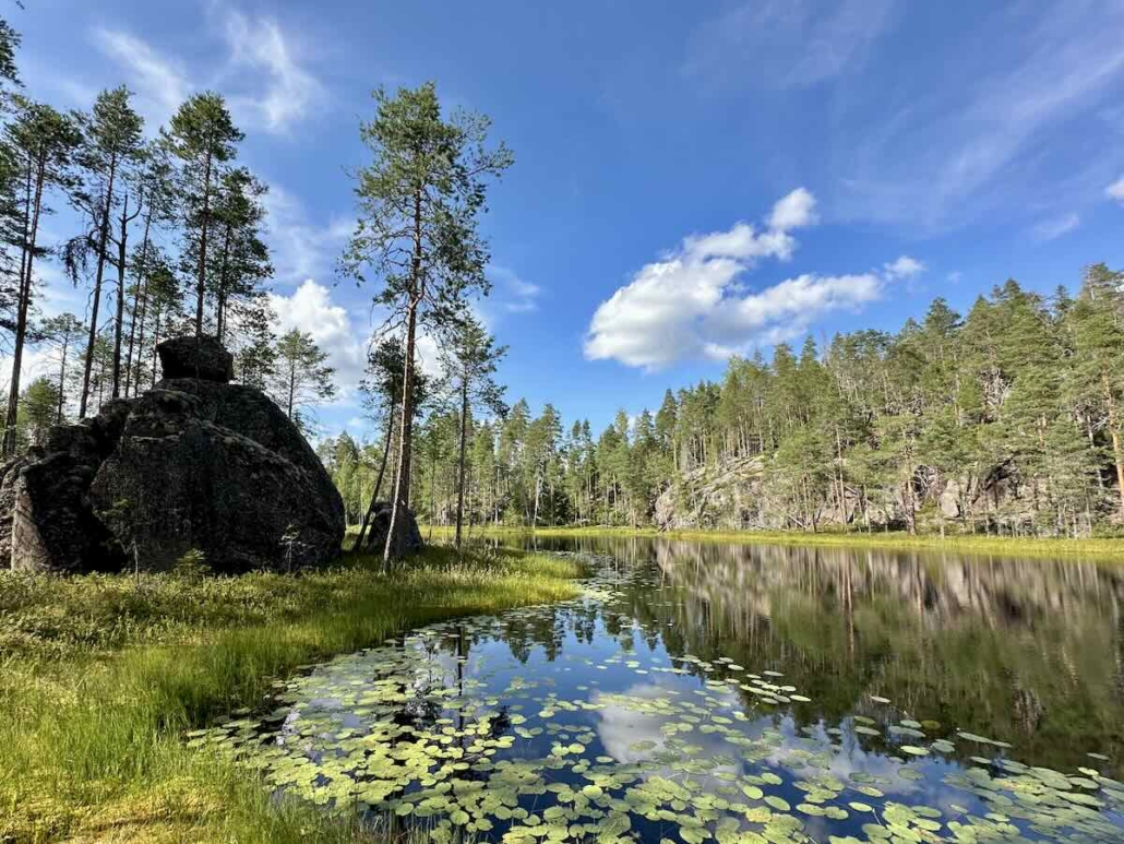 Maasto tasoittuu, ja kohta kuuluu jo haavan lehtien helinää. Tulen erämaajärven rannalle. On aika istahtaa ja laskea reppu viereeni. Levitän makuualustan ja loikoilen rennosti heinä suussa. Katsahdan kuinka lähilahden vesi kimaltelee tyynenä. Telkät venyttelevät ja nautiskelevat rauhasta. Päivä lämpenee ja ensimmäinen paarmakin surisee …hetken. Luontofiilistä ei tarvitse odottaa. Se on läsnä koko ajan. Hörppään lähdevettä ja napostelen omenaa.