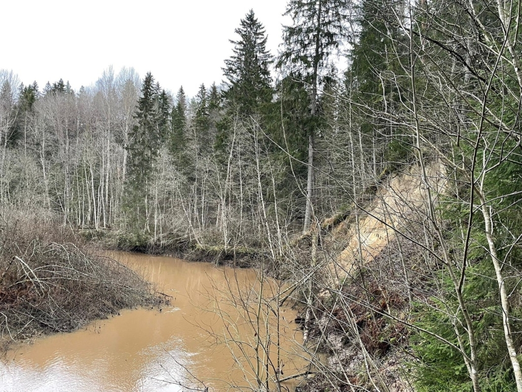 Retkeilyreitti kulkee metsässä ensin jokeen laskevan rinteen päällä, kunnes laskeudutaan jyrkkiä portaita pitkin alas joen rantaan. Täälläkin reitti on sorastettu ja kosteimpiin kohtiin on rakennettu pitkospuut. Yritin kovasti tiirailla, josko joessa näkisi saukon tai jopa kuningaskalastajan. Sellaista tuuria ei nyt ollut, vaikka näitä upeita lajeja joessa kyllä elelee. Joen vesi oli todella sameaa, eikä näkyvyyttä pinnan alla ollut nimeksikään.